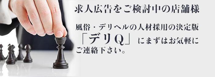 掲載をご希望される店舗ご担当者様は同時掲載される風俗デリヘル情報「デリ王」にてお申し込みを承っておりますので、お気軽にお問い合わせ下さい。すでに「デリ王」に掲載済でデリQに掲載されていない店舗様はこれを機会に是非ご活用下さい。